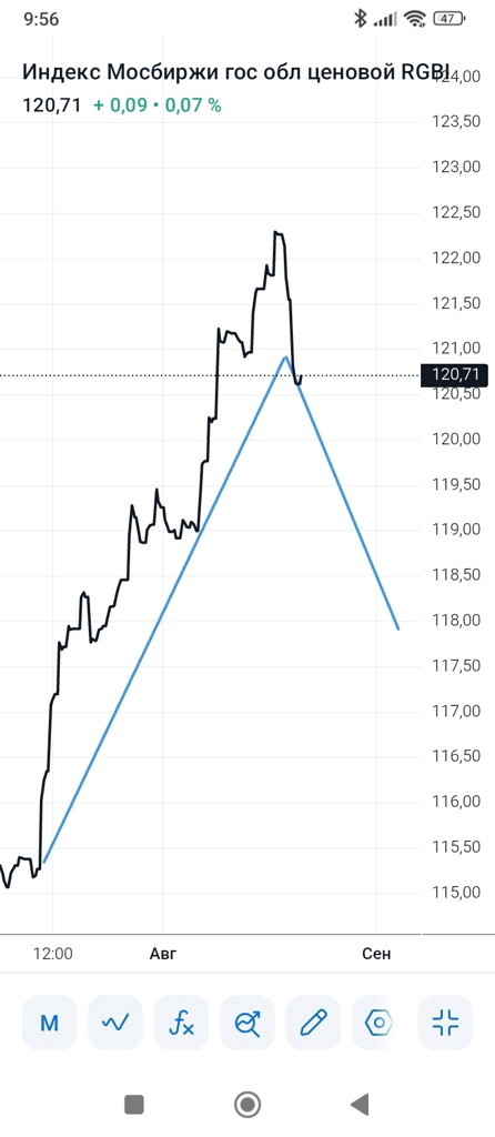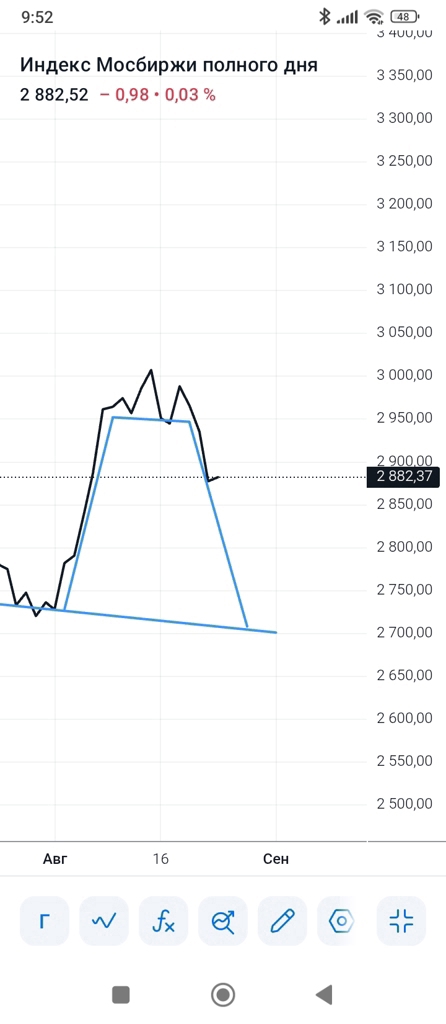 $IMOEX2 1. как и ожидалось рынок, акций рухнул, о чем предупреждал неделю назад и за день до падения тоже. Падение было неизбежно, потому что цены существенно стали выше своих нормальных значений, теперь происходит возврат к ним, по индексу это 2600-2800п. 2. Рынок облигаций $RGBI тоже упал, впервые за полгода так много и это плохой знак, падение может оказатся долгосрочным, возможно, произошла смена трэнда на падение. Чтоб не рисковать, сейчас лучше уйти на все деньги в денежный рынок $BCSD ....