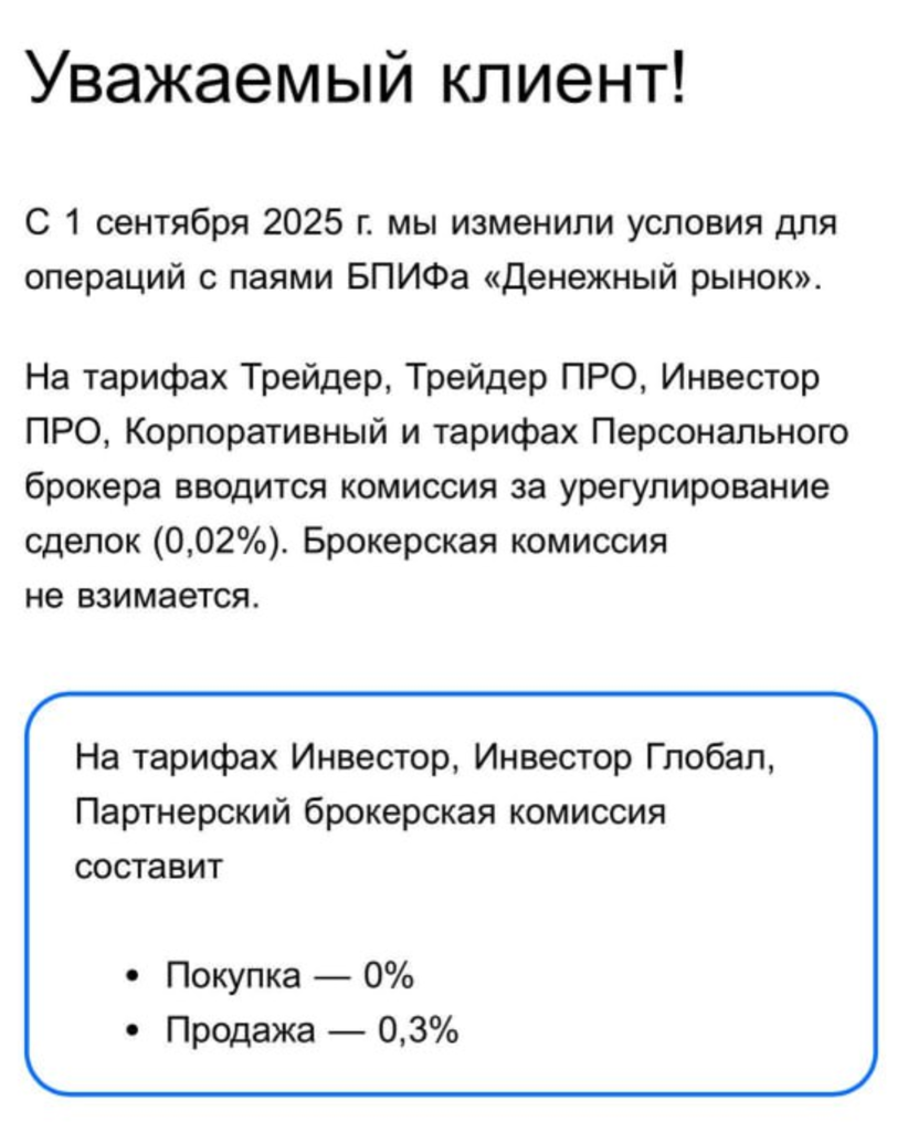 Брокер вводит комиссию за покупку и продажу своего фонда ликвидности $BCSD При этом у них комиссия за управление ещё довольно существенная. Не как в $TMON конечно, где больше 1% в год, но тоже приличная 0.6% что-ли и теперь за торговлю будет комиссия. Т.е выгоднее купить фонд с самой маленькой комиссией. Тот же $LQDT раз комиссия за торговлю одна и та же.