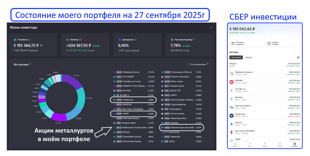 В моём портфеле💼 металлурги занимают немаленькую долю - почти 7% от всего капитала (скрин⬆️ состава портфеля из сервиса учёта инвестиций и приложения СБЕР инвестиции).
