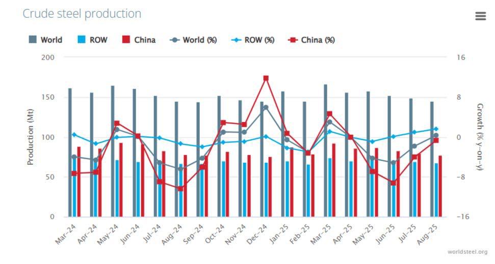 Глобальное производство стали в августе 2025 г. — падение остановилось.