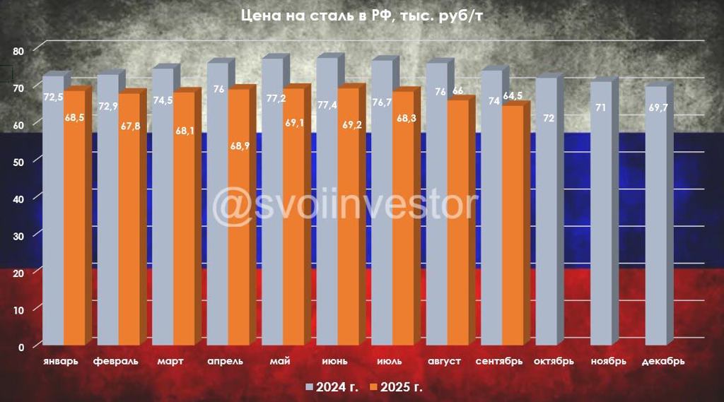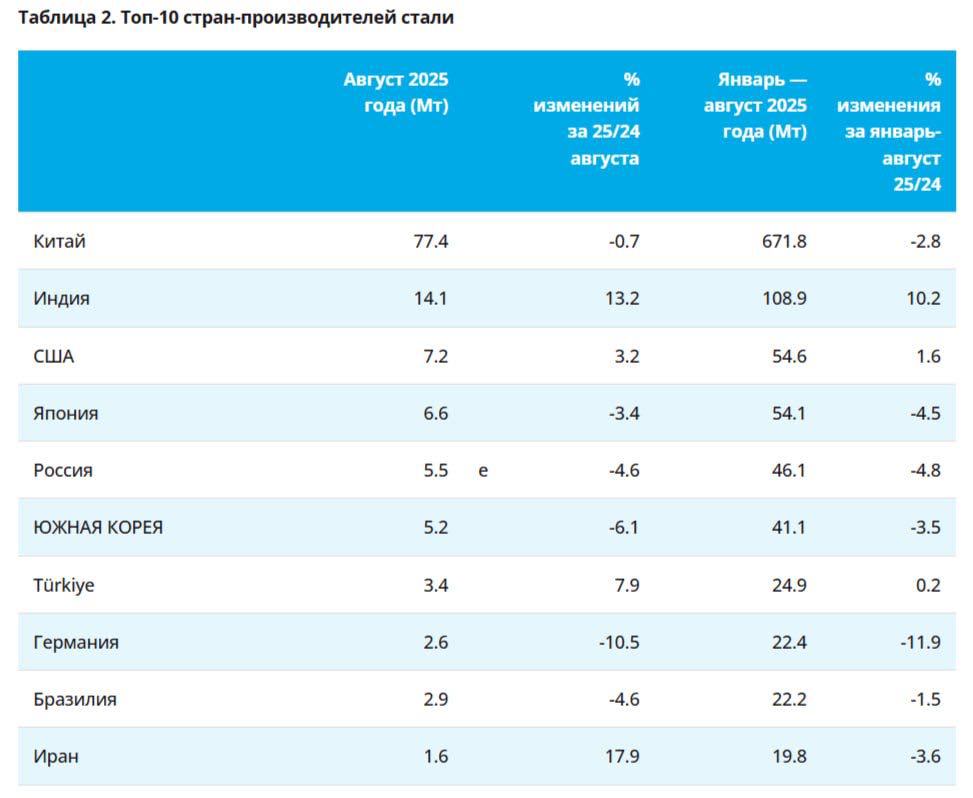 По данным WSA, в августе 2025 г. было произведено 145,3 млн тонн стали (+0,3% г/г), месяцем ранее — 150,1 млн тонн стали (-1,3% г/г). По итогам 8 месяцев — 1230,6 млн тонн (-1,7% г/г). Флагман сталелитейщиков (как по производству, так и по потреблению, поэтому от спроса Китая многое зависит) — Китай (53,3% от общего выпуска продукции) произвёл 77,4 млн тонн (-0,7% г/г), Поднебесная начинает сокращать % разрыв с прошлым годо...