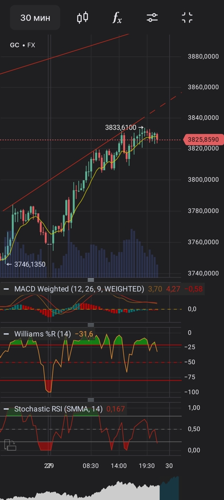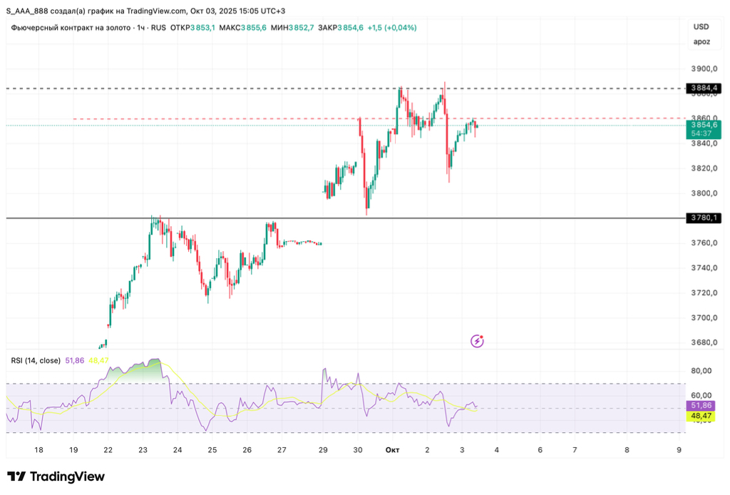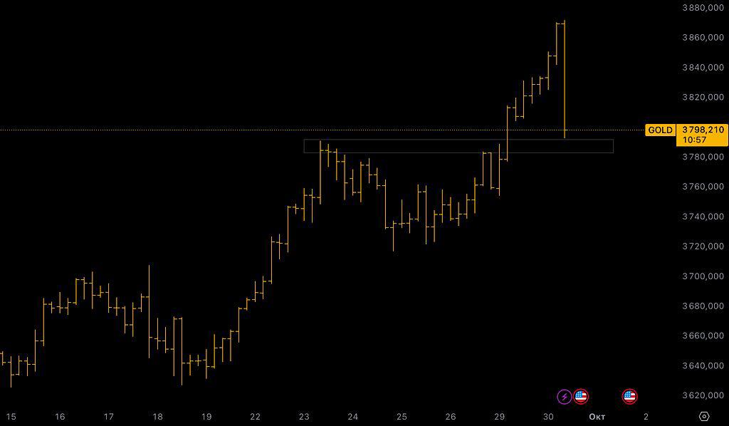 $GDZ5 $GLDRUBF Если по серебру конфигурация похожа на ГиП (см предыдущий пост), то в золоте у нас "кошачьи уши")), ну или что-то вроде неглубокой двойной вершины, которая по факту уже отработана. И также имеем по обе стороны от вершин уровень 3860 , у которого сейчас торгуется цена фьючерса на золото. И, также как и в серебре, вероятен отбой вниз к четко обозначенной ниже поддержке 3780. #Золото #Теханализ #Фьючерсы