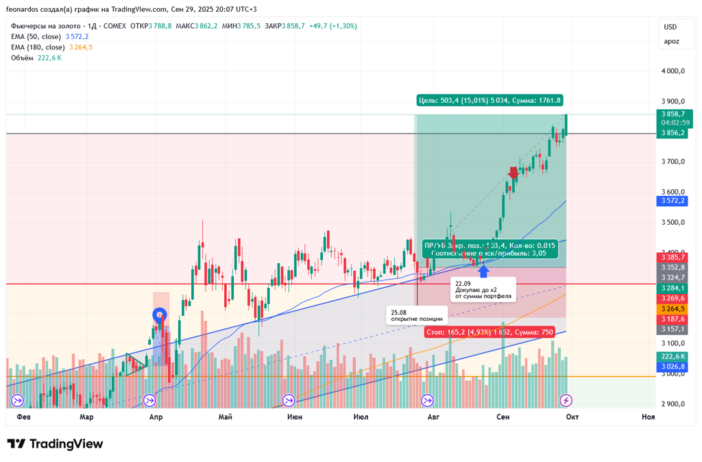 Что лично вам нужно от рынка: быть всегда правым или зарабатывать? Рынок часто преподносит сюрпризы, и текущий взлёт золота - тому пример. Достижение целевых 15% за месяц с небольшим, без какой-либо значимой коррекции - это сильный и откровенно мало кем ожидаемый результат. (Достаточно открыть аналитические материалы за август). Сейчас с волной роста разумеется активизировались "прогнозы" по 5000 к 2026 году. Верим в подобную эйфорию? Конечно же нет. Пора сворачивать позиции. В свою очередь,...