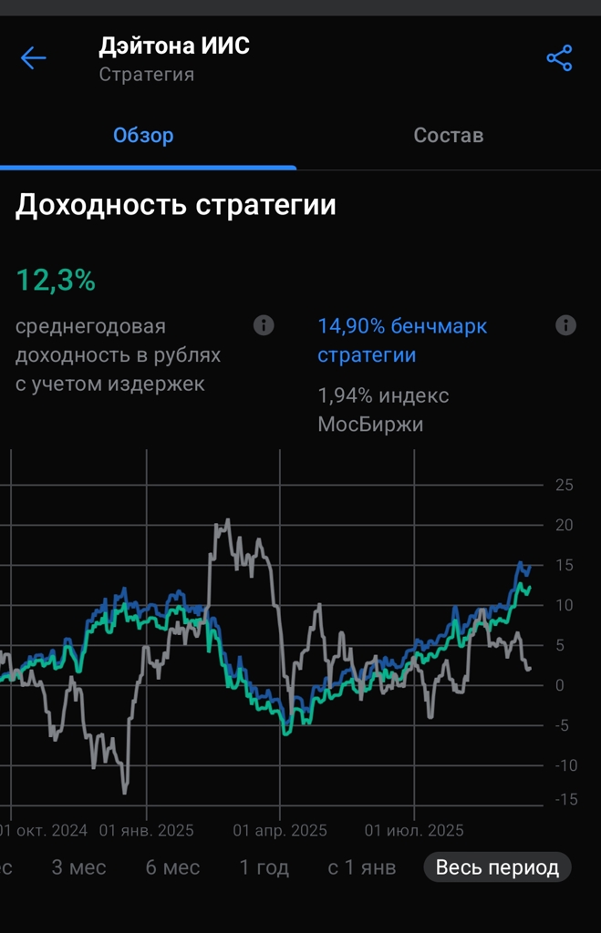 Ровно год назад на платформе БКС Финтаргет была запущенастратегия автоследования Дэйтона ИИС. Сегодня можно подвести итоги и показать, как она прошла свой первый год. ✅Динамика за год: рост портфеля на 12.4% и как достигнут За первый год стратегия показала результат, сопоставимый с динамикой базовых активов. Доходность составила 12,4 %. Финансовый результат по ключевым компонентам стратегии за последние 12 месяцев: -Индекс Nasdaq вырос на 23%, при весе в портфеле до 60 % вклад в прост портфе...