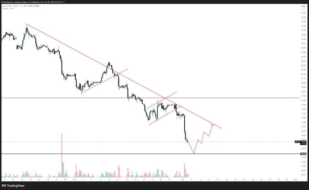 Разбор актива $MTLR Обратите внимание на то, что цена актива двигается в рамках нисходящей структуры - ранее 2 фазы импульсного снижения были на 16%, текущая пока на 12, ожидаю снижение еще на 4 процента до отметок 63.8, которое можно было бы рассмотреть в шорт по закономерности движения цены, после чего ожидаю отскок до нисходящей трендовой линии, которая является динамическим сопротивлением, в случае если трендовая линия сломится, то актив станет привлекательным до отметок 75, но важно чтоб...