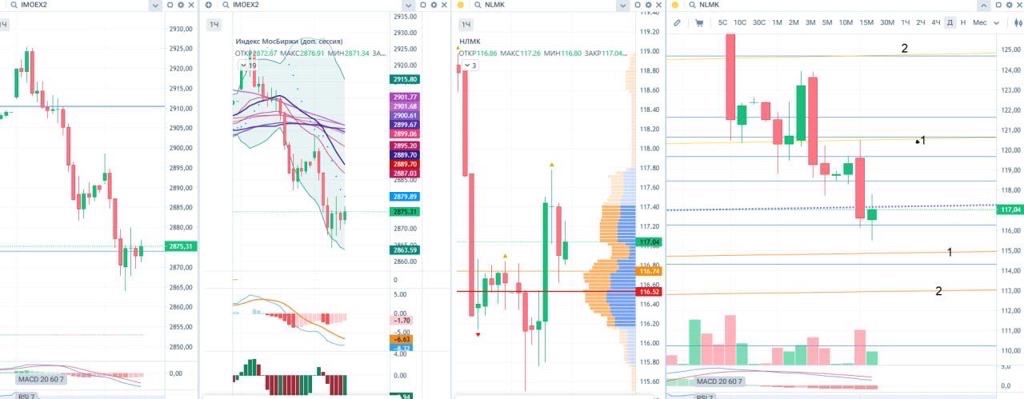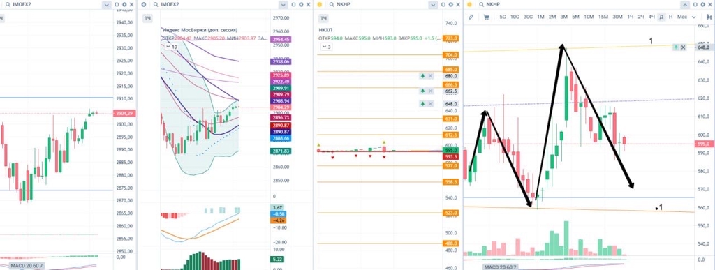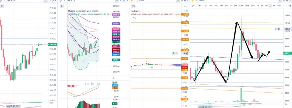 ⚡️ Итоги прогнозов | Часть 2 5. РКК Энергия ( $RKKE ) Цена не смогла закрепиться над 19 970.0 и откатилась — это негативно. Сейчас почти достигнут уровень 17 360.0, от него небольшой отскок — нормально. Пока картина не радует: ставили на запуск 20 августа (научные эксперименты), но рынок воспринял вяло. Откладываем бумагу, с нового месяца пересмотрим график 6. М.Видео ( $MVID $MVU5 ) Цена практически достигла первой жёлтой линии 100.45 и откатилась к синусоиде. Синусоида выдержал...