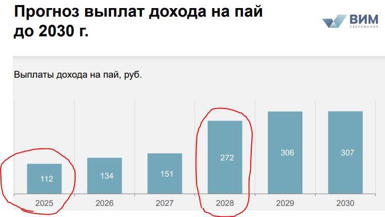 Рентный доход ПРО от ВИМ Сбережения(ВТБ). Данный фонд они назвали не классическим ЗПИФом на недвижимость, а новомодным ЗПИКФ(комбинированный фонд, хотя комбинируют они всё ту же недвижимость). В фонде складская и офисная недвижимость Московского региона с привлечением заемного финансирования. А теперь, внимание на скрин с плановыми выплатами на ближайшие годы. в 2025м выплата 112р на пай до налогов. Это 8.8% годовых после вычета налогов от текущей цены. Скажете - очень мало, ведь есть ЗПИФы, ко...