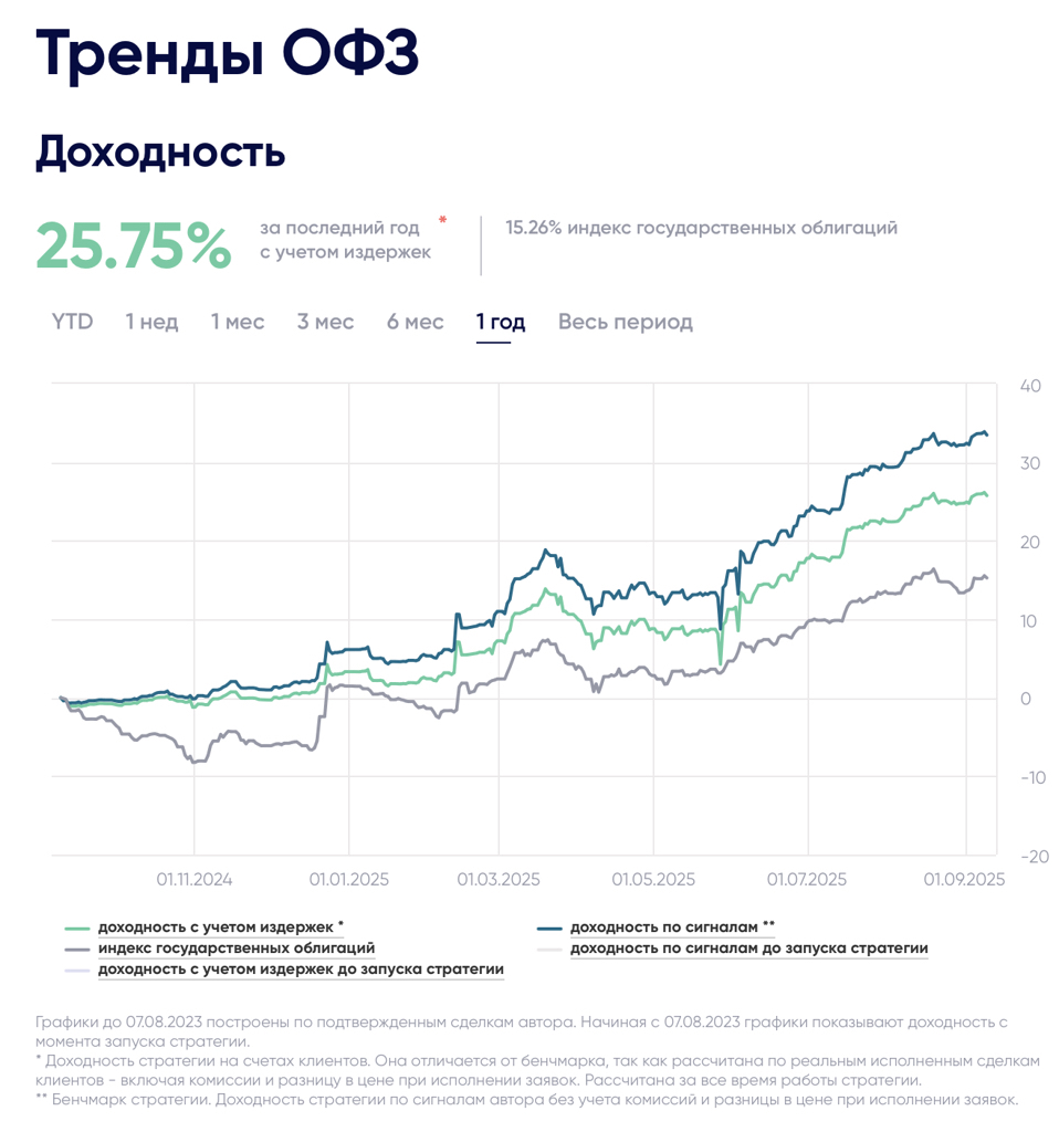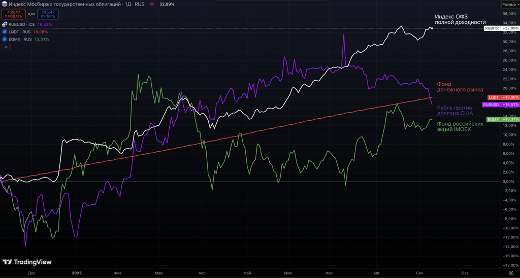 Длинные ОФЗ стали лучшим трейдом на российском рынке в 2025 году, опередив депозиты, валюту, денежный рынок и акции. Именно это я прогнозировал в ноябре 2024 года в серии публикаций здесь https://bcs-express.ru/profit/post/582a348a-3c7b-4ba7-a8e7-8bdcbfe81f4c . Именно тогда и начался цикл роста в ОФЗ (см. график). Однако, в настоящий момент отмечается некоторая перегретость рынка ОФЗ.
