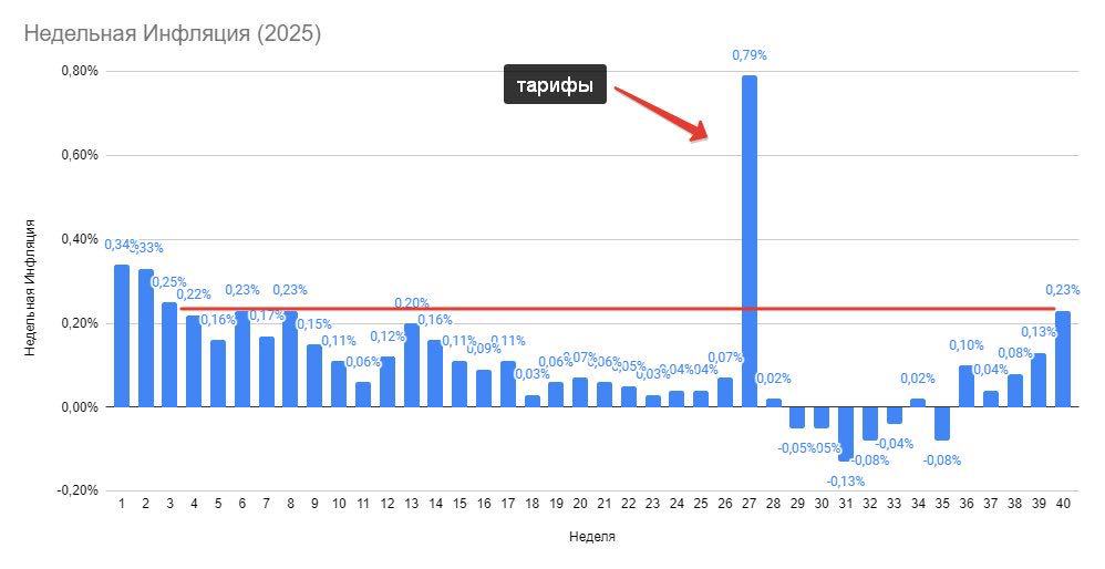 🔔 По данным Росстата, за период с 30 сентября по 6 октября ИПЦ составил 0,23% (прошлые недели — 0,13%, 0,08%), с начала месяца 0,20%, с начала года — 4,53% (годовая — 8,11%). Месячный пересчёт сентяб...
