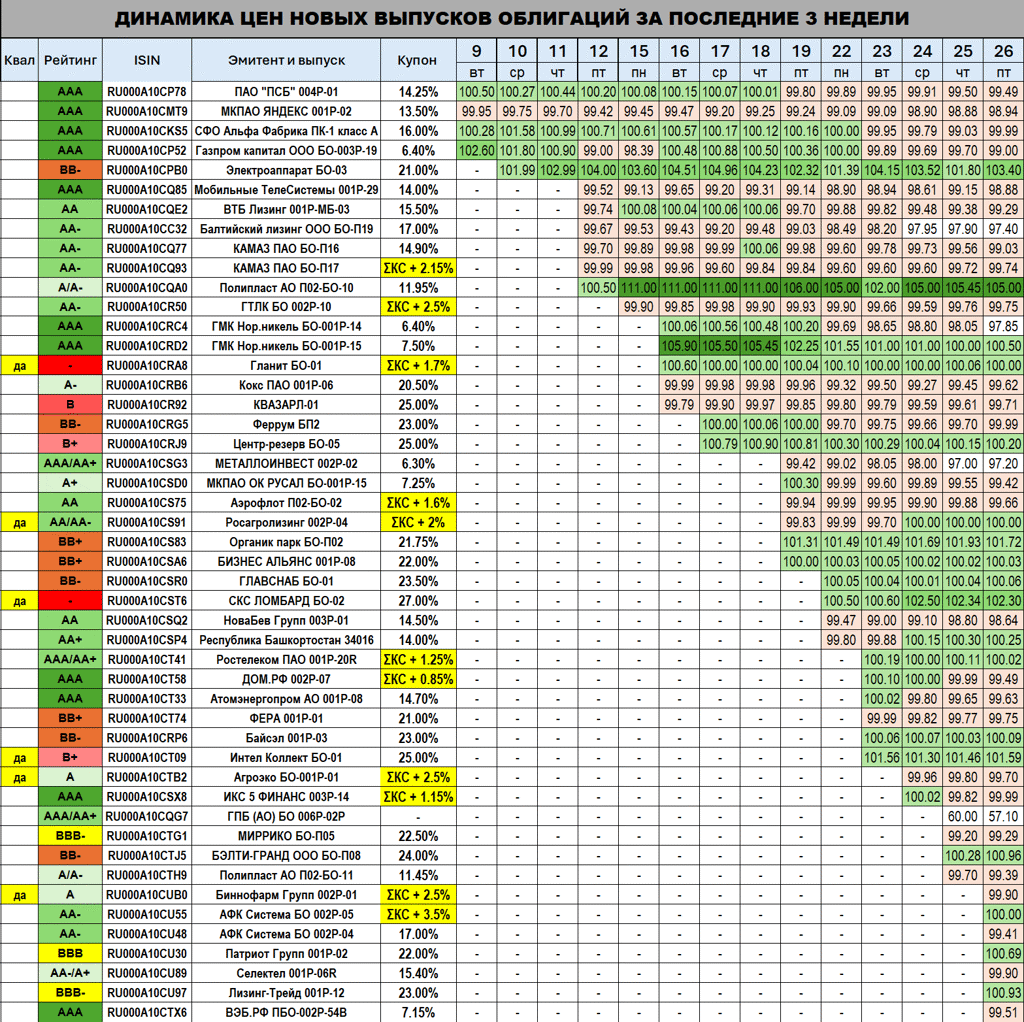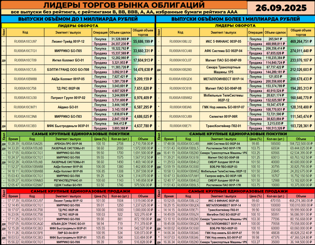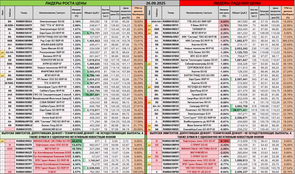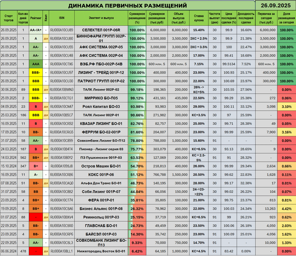 ИТОГИ ОСНОВНОЙ СЕССИИ 2️⃣6️⃣☀️0️⃣9️⃣☀️2️⃣0️⃣2️⃣5️⃣ 🍷 Беспокойный вечер нужно закончить чем-то прекрасным. Умиротворяющие бесконечные цифры вполне подойдут :) Напомню, что по пятницам данная рубрика появляется на всеобщее обозрение :) ⭐️ 7 новинок дня разместились без особых сложностей. Всех упоминать не буду, но аллокацией прославились $RU000A10CU89 СЕЛЕКТЕЛ 001Р-06R, $RU000A10CU97 ЛИЗИНГ - ТРЕЙД 001Р-12, $RU000A10CU30 ПАТРИОТ ГРУПП 001Р-02 и даже самую малость $RU000A10CTX6 ВЭБ.РФ ПБО-002Р-5...