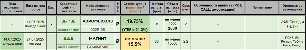 ОБЛИГАЦИОННЫЕ НОВИНКИ 1️⃣4️⃣☀️0️⃣7️⃣☀️2️⃣0️⃣2️⃣5️⃣ 🕰 Ого, уже середина июля, - пронеслась в голове мысль с утра пораньше... Доброе утро, друзья, как же время неумолимо... Ну да ладно, все равно сделать с этим ничего не получится, а вот про новые выпуски облигаций я рассказать всегда рад! ▶️ Встречайте в портфелях (с заметной аллокацией) и биржевом стакане после обеда: 🟩 АЭРОФЬЮЭЛЗ 002Р-05 📊 🅰️➖ / 🅰️ (Эксперт / НКР) 🔹 $RU000A10C2E9 ▪️ Купон фиксированный: 19.75% ✅ Без оферт ▪️ 2 года ...