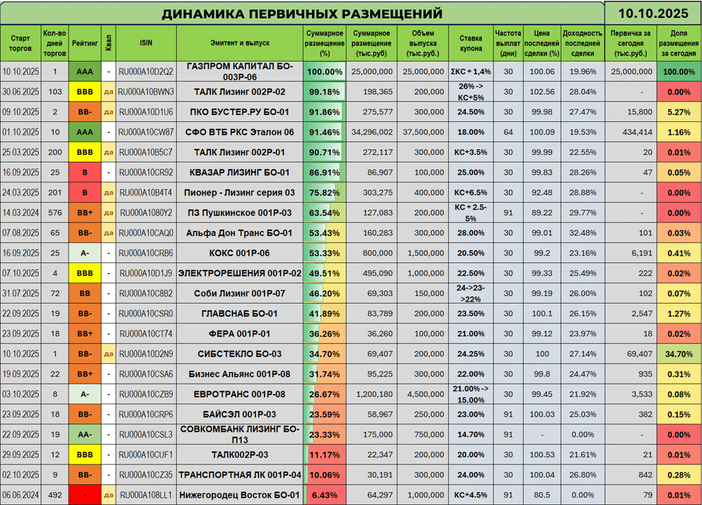 🙃 Пятничный статистический пост в студии! Напомню, что проявляет себя он тут еженедельно. ⭐️ Первичка вновь не в фокусе внимания - разумеется, разместился $RU000A10D2Q2 ГАЗПРОМ КАПИТАЛ 003Р-06 - видели ли его хоть разок застрявшим? :) Наверное, если такое произойдет, вокруг будет уже очень плохо 😀 $RU000A10D2N9 СИБСТЕКЛО БО-03 доставило в рынок чуть больше трети объема, что на достаточно тривиальных параметрах можно посчитать успехом. ⬆️ День можно посчитать нейтрально-позитивным - ведь восс...