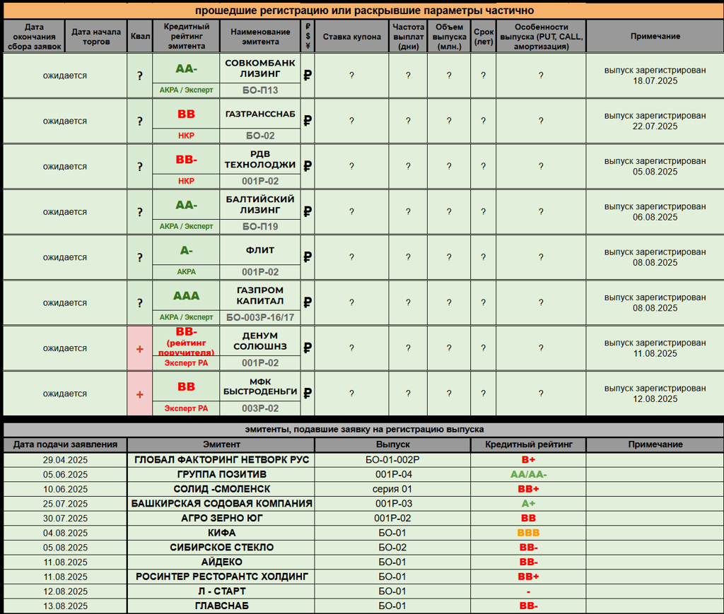 ✌️ Очередная среда прислала новостных событий, требующих распространения. Чем и займусь, как я люблю :) ---------- 🆕 НОВЫЕ РАЗМЕЩЕНИЯ / АНОНСЫ: 🔆 КОКС (🅰️➖) в студию! Эмитент с внушительным долговым карманом желает подкрепиться с помощью выпуска 001Р-04. По плану - 1,5 миллиарда рублей, 3 года торгов (но пут-оферта через 1,5), ежемесячный купон, ориентир ставки - не выше 22% ровно. И это нынче щедрый старт проблемной компании, такие времена. Как же всем хочется на всякий случай до заседан...