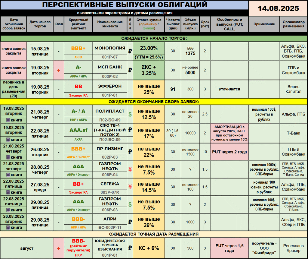 ОБЛИГАЦИОННЫЙ ВЕСТНИК 1️⃣4️⃣☀️0️⃣8️⃣☀️2️⃣0️⃣2️⃣5️⃣ ‎ ‎🔥 Неоспоримый антигерой нынешнего дня - ГПБ, а почему - мы это скоро узнаем. Добрый вечер, друзья! ‎ ‎---------- ‎🆕 НОВЫЕ РАЗМЕЩЕНИЯ / АНОНСЫ: ‎ ‎🔆 Производитель медицинских устройств ЭФФЕРОН (🅱️🅱️) готов порадовать любителей ВДО и заявляет, что хочет занять 300 миллионов рублей с помощью выпуска 001Р-01. Нам предлагают 3 года торгов (наличие оферт пока не разглашается), а также ежеквартальные купоны не выше 25% (уточнение последует бл...