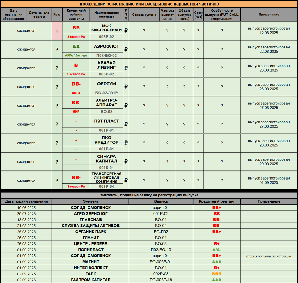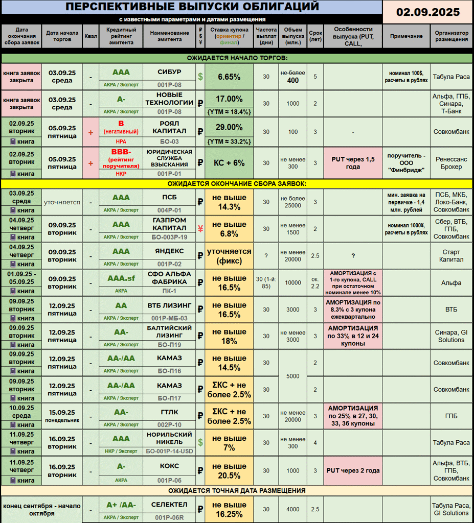 ОБЛИГАЦИОННЫЙ ВЕСТНИК 0️⃣2️⃣🍁0️⃣9️⃣🍁2️⃣0️⃣2️⃣5️⃣ ‎ 🗄 Сегодня для отдела регистраций Мосбиржи настоящее испытание, но обо всём по порядку - добрый вечер, друзья! ‎ ‎---------- ‎🆕 НОВЫЕ РАЗМЕЩЕНИЯ / АНОНСЫ: ‎ 🍁 КОКС (🅰️➖) значительно ускорился - не прошло и дня с регистрации выпуска 001Р-06, а уже сегодня объявляют параметры! Итак, действительно 3-х летний выпуск на 1 млрд. рублей будет приносить не выше 20,5% ежемесячными купонами. Однако есть промежуточная остановка - оферта через 2 года...