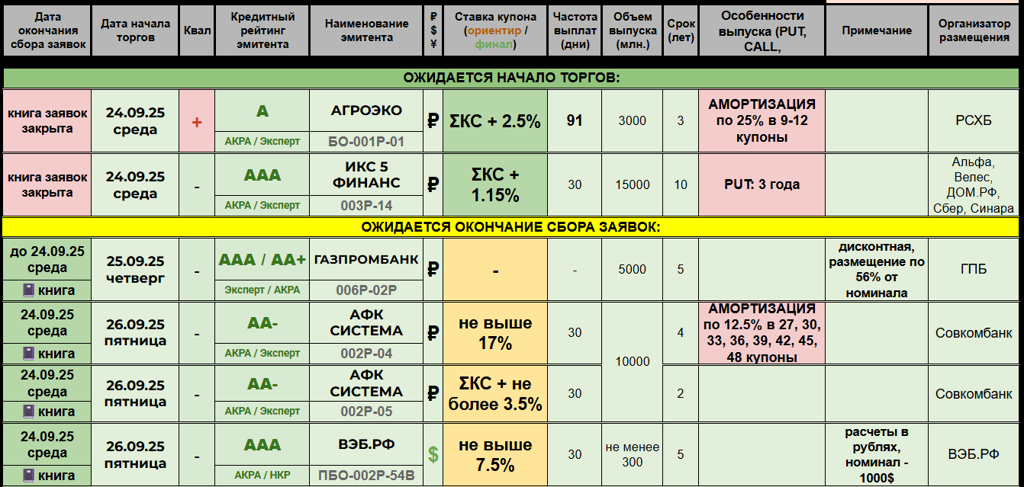 ОБЛИГАЦИОННЫЕ НОВИНКИ 2️⃣4️⃣☀️0️⃣9️⃣☀️2️⃣0️⃣2️⃣5️⃣ 🌞 Солнечного утра, леди и джентльмены! Новинок сегодня поменьше прибежало, но внимания требуют. Не смею им отказывать, нам с вами во благо :) 🏄 Два флоатера в ожидании начала торгов на низком старте: 🛍 ИКС 5 ФИНАНС 003Р-14 $RU000A10CSX8 📊 🅰️🅰️🅰️ (АКРА, Эксперт) ◾️Купон ежемесячный: ΣКС + не выше 1,15% ⚠️ PUT через 3 года ◾️ 10 лет до погашения 🌾 АГРОЭКО БО-001Р-01 $RU000A10CTB2 📊 🅰️ (АКРА, Эксперт) 👑 Только для квалов ◾️Купон еж...