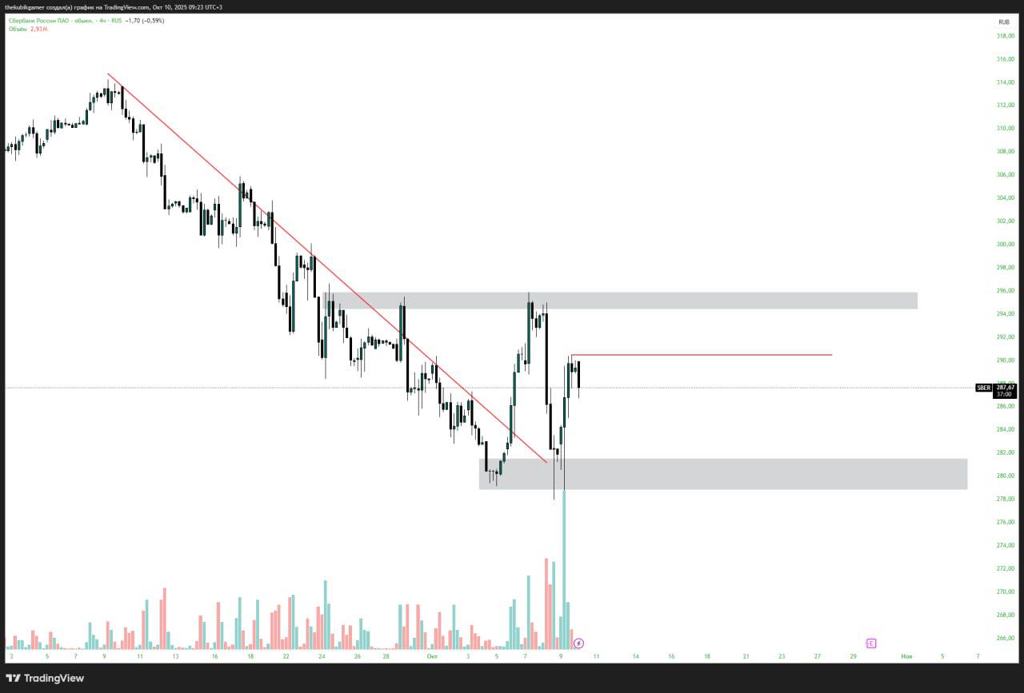 🏦 Сегодня купили $SBER . Учитывая высокую волатильность, стоп ставим ниже 279 ₽ (риск <3,5%), краткосрочная цель 👉 310 ₽ с увеличением позиции при закреплении выше 296 ₽. При этом тренд нисходящий и риск продолжения снижения высок, поэтому тестовая покупка спекулятивная и небольшая. Что думаете? Ставьте лайки ❤️ и делитесь с друзьями 😉. #Сбер #СберИнвестлэнд #Трейдинг #ИтрейдингИдеи #Теханализ ℹ️ Информация носит аналитический характер, не является ИИР