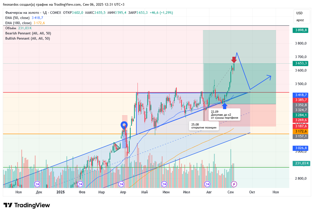 В предыдущих постах я обозревал фьючерсы на золото как защиту от девальвации. Я приобрёл декабрьский фьючерс сначала на сумму портфеля, а затем, пользуясь коррекцией, довёл позицию до двойного плеча. К моему удивлению, доходность пришла быстрее, чем я ожидал, и золото за короткое время показало рост более 7% на фоне ожиданий изменения ставок в ФРС. Сегодня я зафиксировал 2/3 прибыли, поскольку вижу риск коррекции. Сейчас держу золото на 65% моего портфеля. Теперь, дорогие читатели, вопрос к ва...