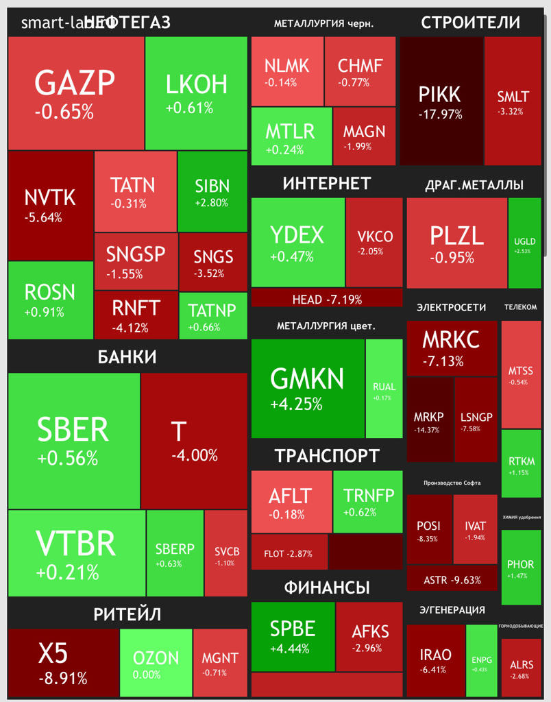 ПИК (–9,7%), СПБ Биржа (–8,6%), ВУШ (–7,8%), Мечел-ап (–7,7%...