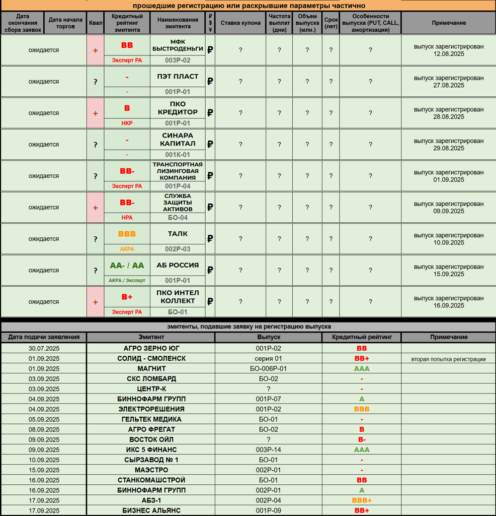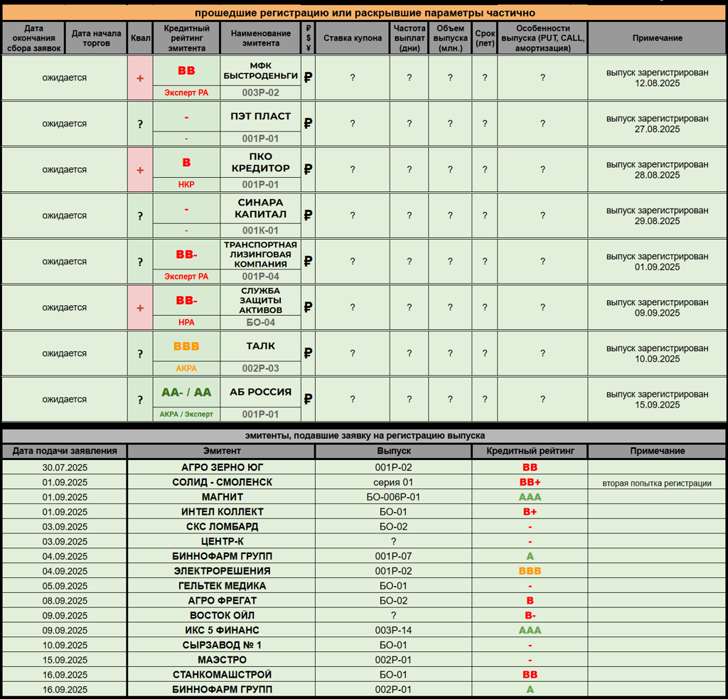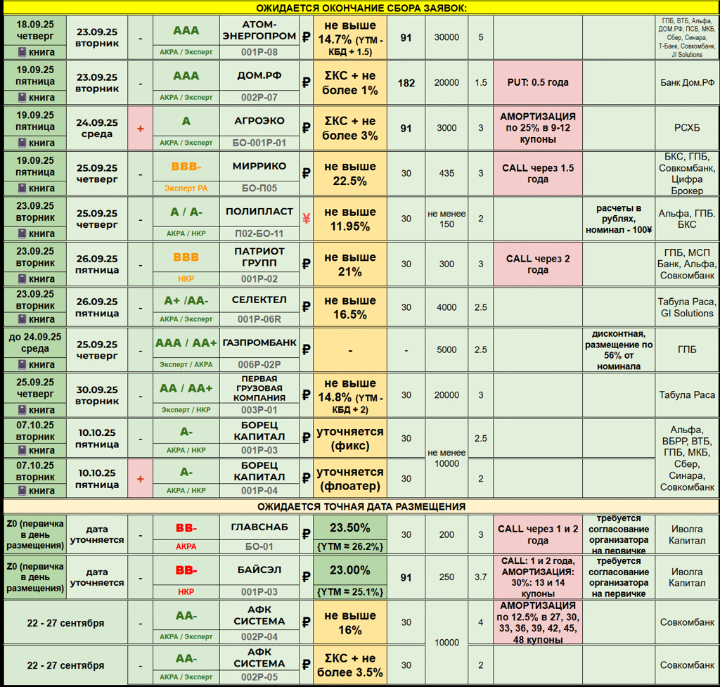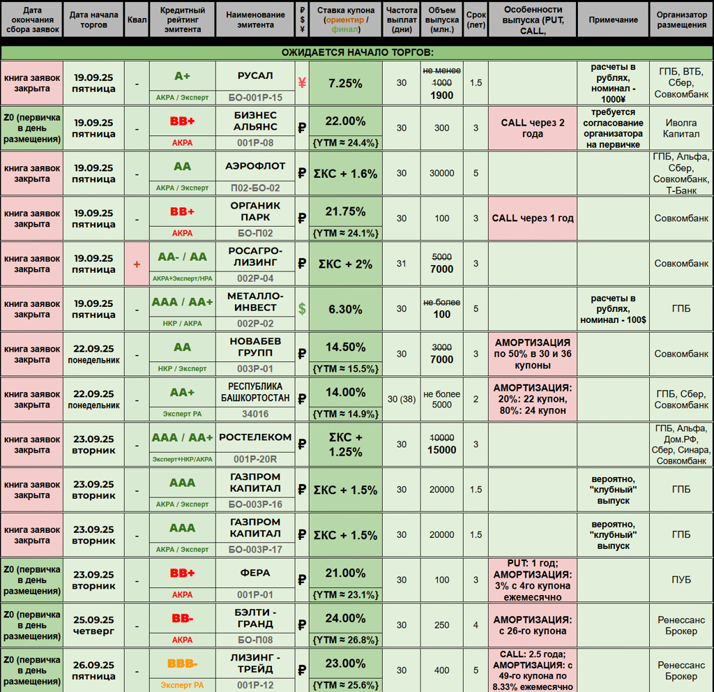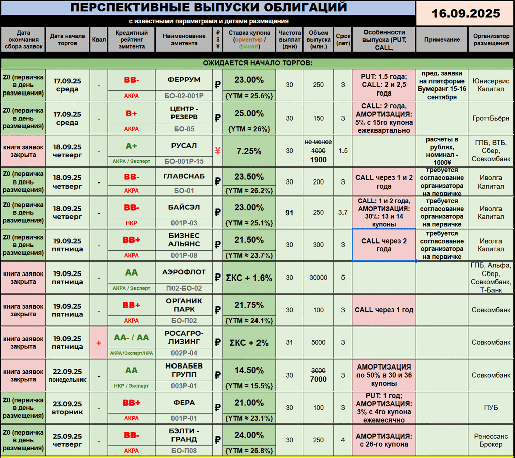 ОБЛИГАЦИОННЫЙ ВЕСТНИК 1️⃣7️⃣🍁0️⃣9️⃣🍁2️⃣0️⃣2️⃣5️⃣ ‎ 🏞 Новостная река размеренно течёт по биржевой равнине - добрый вечер, друзья! ‎ ‎---------- ‎🆕 НОВЫЕ РАЗМЕЩЕНИЯ / АНОНСЫ: ‎ 🍁 БИЗНЕС АЛЬЯНС (🅱️🅱️➕) повышает ежемесячный купон по выпуску 001Р-08 до 22%. Остальные условия остались те же: 3 года торгов, объём 300 млн. рублей, CALL через 2 года. Сбор заявок и размещение 19 сентября, организатор - Иволга. Nekto: глобально ничего не поменялось, однако сия практика на рынке выглядит интересно...