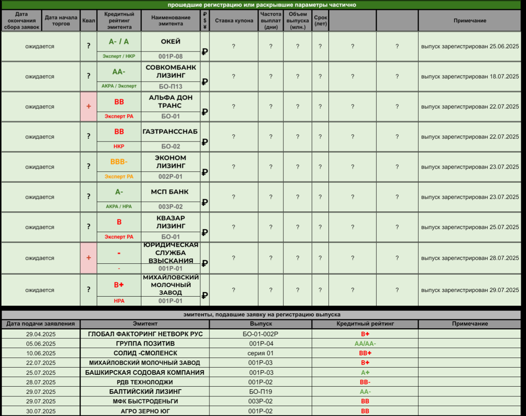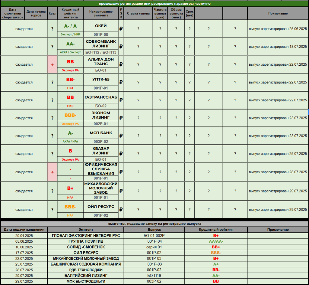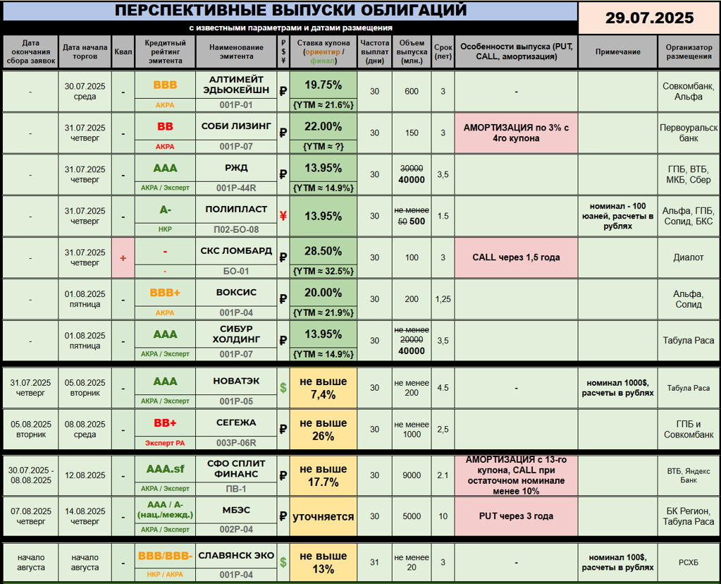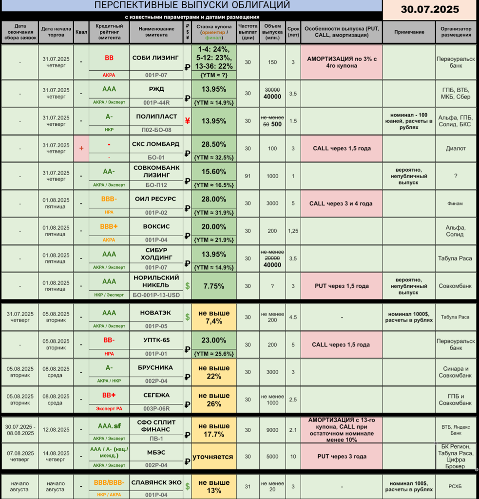 ОБЛИГАЦИОННЫЙ МИНИ-ВЕСТНИК 2️⃣9️⃣☀️0️⃣7️⃣☀️2️⃣0️⃣2️⃣5️⃣ (отпускная версия) 🤔 Маленький новостной пост собрался с трудом, ибо планы отпуска несколько шатаются. Однако попробую завтра их привести в чувство. ---------- 🆕 НОВЫЕ РАЗМЕЩЕНИЯ / АНОНСЫ: 🔆 СКС ЛОМБАРД (без рейтинга): 100 миллионов рублей, 3 года торгов (call - 1,5 года), ежемесячный купон 28,5%. Доступна бумага только квалам, старт торгов - 31 июля (первичка в этот же день до обеда). Организатор - Диалот. 🔆 СФО СПЛИТ ФИНАНС ПВ-1...