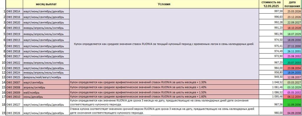 На прошлой неделе разобрали что такое облигации с переменным купоном, а сегодня предлагаю рассмотреть какие есть ОФЗ. Стоимость указана на 12.09.2025.