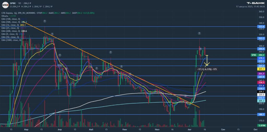 "$SPBE По моему сценарию идеальным будет открытие на 6% ниже текущих - по 265р, там проходит хорошая поддержка, сейчас на дневке там стоит ЕМА16, в таком случае буду смело брать, рассчитывая на отличный отскок."