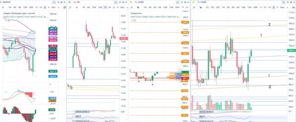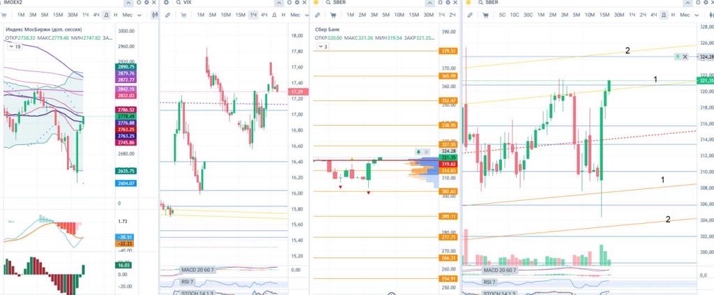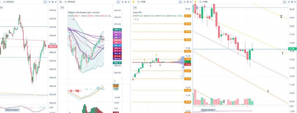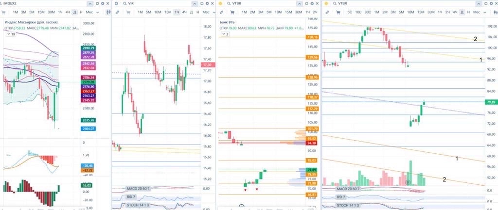 Несмотря на это, вчера вечером открыл шорт по фьючерсу на ВТБ $VBU5 с коротким стопом за вчерашний максимум и целями на ~7500-7300 руб. На мой взгляд, инструмент все-таки слабее рынка.