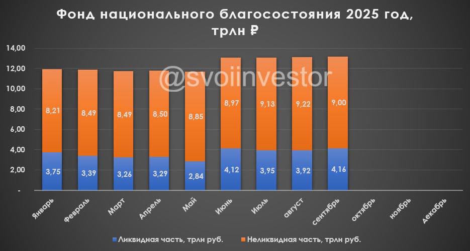 Инвестиции в Газпром продолжаются, как и очередная помощь Газпромбанку. Ликвидной части хватит? Минфин РФ опубликовал результаты размещения средств ФНБ за сентябрь 2025 г. По состоянию на 1 октября 2025 г. объём ФНБ составил 13,16₽ трлн или 5,9% ВВП (в августе — 13,14₽ трлн). Объём ликвидных активов фонда (средства на банковских счетах в Банке России) составил 4,16₽ трлн или 1,9% ВВП (в августе — 3,92₽ трлн). Министерство нарастило инвестиции в этом месяце — 56,6₽ млрд (в августе — 20,7₽ млрд),...
