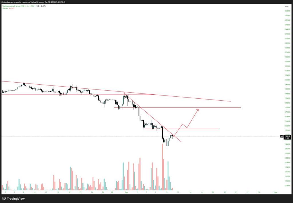 Далее важно следить за тем, как будет формироваться модель пробития: 1) «обратный ход» до линии тренда и продолжение нисходящей динамики или 2) попытки вернуться обратно за уровень 2 800 руб. – там располагается ближайшее сопротивление.