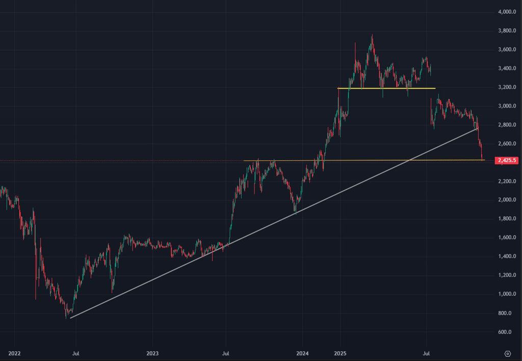 Пока актив выглядит слабее рынка, но в случае если цена актива закрепится выше отметок импульсом 2596 - сломит локальную нисходящую структуру, то рассмотрю спекулятивный лонг до отметок 2750 - диапазон сопротивления от которого цена актива ранее формировала ранее негативную реакцию